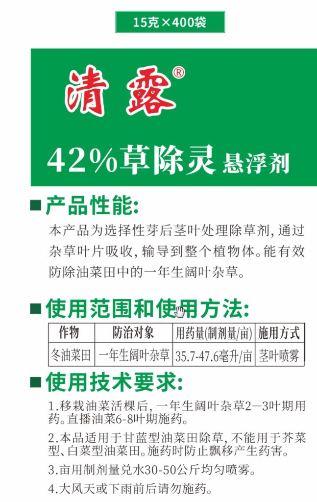 [產品性能]本產品為選擇性芽后莖葉處理除草劑,通過雜草葉片吸收,輸導到整個植物體。能有效防除油菜田中的一年生闊葉雜草。